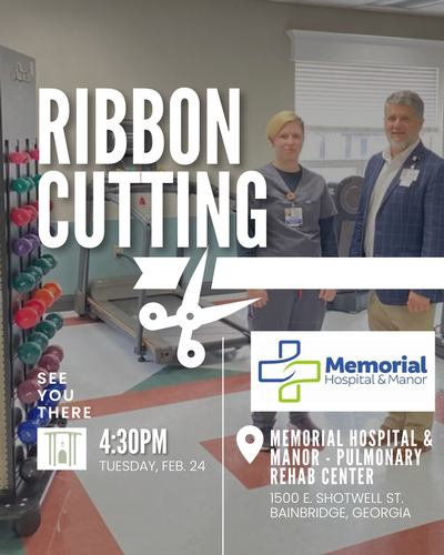 Please join us for a ribbon cutting ceremony celebrating Memorial Hospital & Manor’s new Pulmonary Rehab Center on Tuesday, February 24, from 4:30 to 6:00 PM, with the ribbon cutting taking place at 4:30 PM. Refreshments will follow.