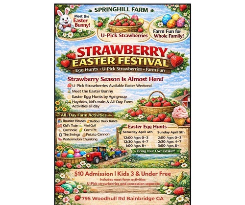 Celebrate Easter weekend at Springhill Farm with egg hunts, strawberry picking, and a full day of family fun! Open Saturday 10-5 and Sunday 12-5.